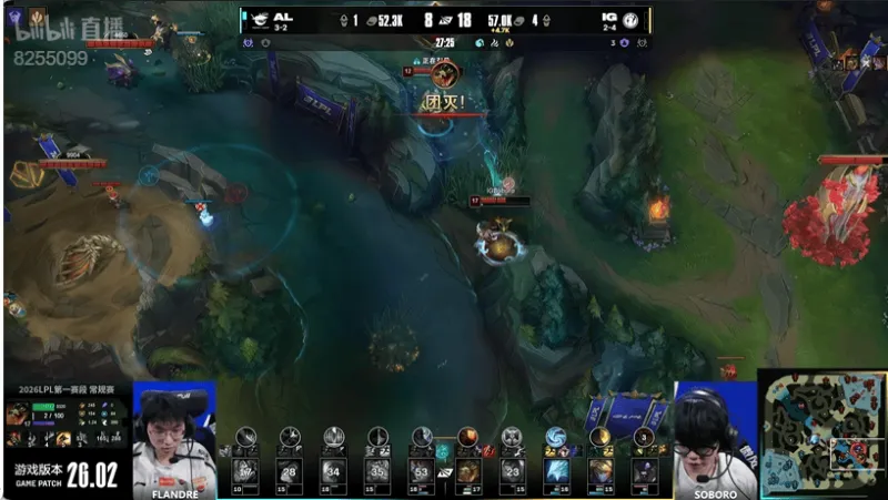 29分钟:阿萝拉探被鳄鱼秒掉,随后AL五打四逐个击破团灭对手拿到大龙