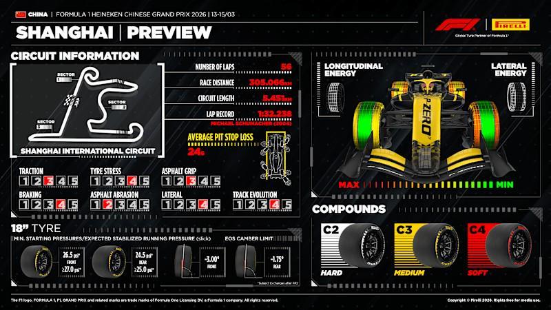 北京时间3月13日,F1中国大奖赛将拉开帷幕。轮胎供应商倍耐力就本场比赛进行前瞻,本站将使用C2到C4三款配方的轮胎。
