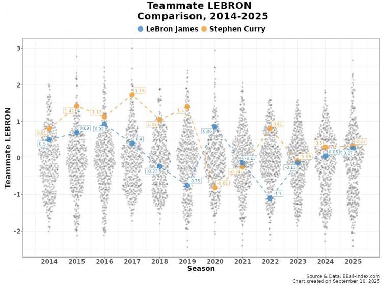 直播吧9月12日讯 近日,数据媒体BBall-Index晒图比较了2014-2025年期间詹姆斯和库里的队友强度。