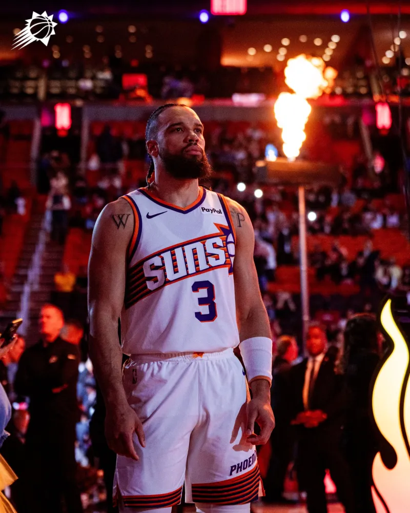 比赛中,太阳社媒晒出狄龙-布鲁克斯今日赛前热身时的个人特写照片,并配文:反派。